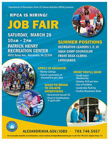 RPCA is seeking qualified and dedicated professionals to deliver the high-quality services and programs RPCA customers expect. Although the job fair has been cancelled, virtual interviews will be conducted for recreation leaders, aqua camp counselors, front desk clerks, and lifeguards. To participate, interested candidates should submit an application at alexandriava.gov/Jobs. Interviews will take place for each position on a rotating basis throughout the event.