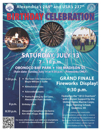 Event Details:237th Annual USA/264th Alexandria Birthday Celebration. Musical entertainment, food and beverage sales and fireworks.