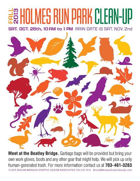 Event Details:Volunteer to cleanup Holmes Run this Saturday, October 26. Volunteers will meet at Beatley Bridge in Holmes Run Park, located at the intersection of North Pickett Street and Holmes Run Parkway. Garbage bags will be provided. Please bring your own work gloves, boots, and other gear that might help during the cleanup. Join others to make a difference in our community.
