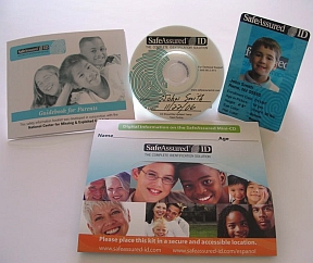 SafeAssured ID provides families with all the vital information needed by law enforcement and the media to immediately broadcast information unique to a missing child. Parents will receive a completed, ready-to-use ID kit for their child. The free kit contains a privacy-protected mini-CD, which acts as a single storehouse of personal identification information essential to locating a missing child. Families also receive a photo data card and a Parents’ Guidebook with prevention tips, written in conjunction with the National Center for Missing & Exploited Children.