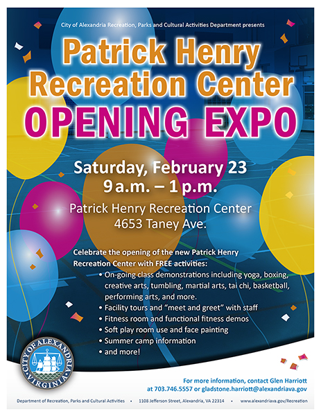 Celebrate the opening of the new Patrick Henry Neighborhood Recreation with free activities for all ages including class demonstrations, fitness room and functional fitness demos, soft play room use, exhibitors, summer camp information, facility tours, face painting, DJ music, and a “meet and greet” with center staff. On-going class demonstrations will include yoga, boxing, creative arts, tumbling, martial arts, tai chi, basketball, performing arts, and more.
