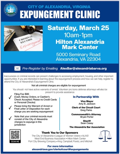 Event Details:Inaccuracies on criminal records present challenges to accessing employment, housing, and other important opportunities. If you are interested in learning about the expungement process and how we can help, register to attend the City of Alexandria’s Expungement Clinic.