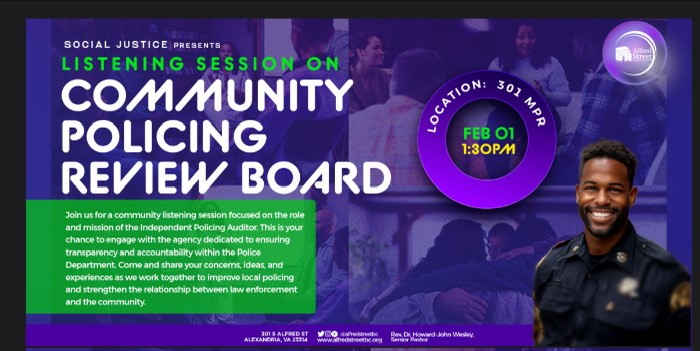 Social Justice presents a Listening Session on the Community Policing Review Board in Alexandria, VA. This event is being held at the Alfred Street Baptist Church located at 301 S Alfred St, Alexandria, VA 22314.