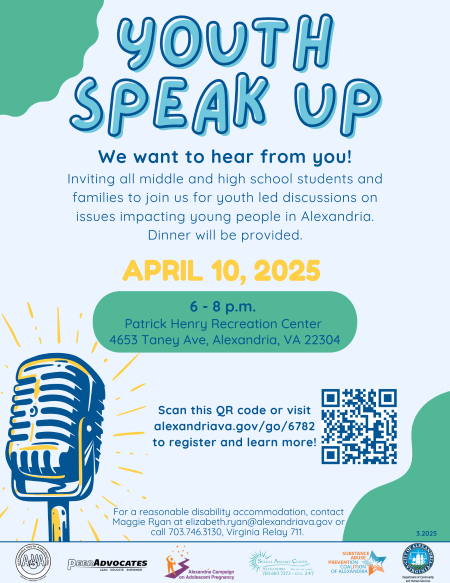 You are invited to attend Alexandria Youth Speak Up on April 10 from 6-8 p.m. at Patrick Henry Recreation Center. This event will bring together middle school youth, high school youth, and adults to hear directly from youth about the issues they are facing.