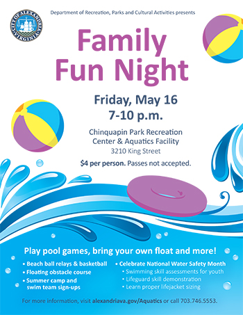 Bring a pool float and the whole family for fun for all ages. Pool games include beach ball relays, water basketball and fun on the floating obstacle course. Celebrate National Water Safety Month with swimming skill assessments for youth, a lifeguard skill demonstration and learning proper lifejacket sizing. Sign-ups for summer camps and Wahoos Youth Swim Team will also be available on-site.