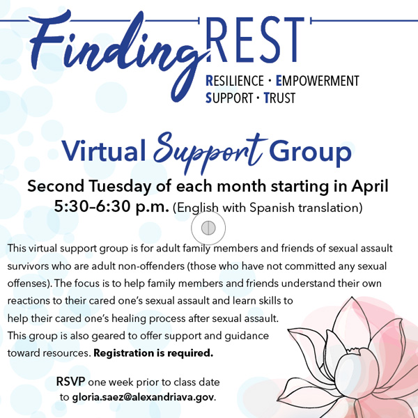 Event Details:Finding REST Virtual Support Group is for adult family members and friends of sexual assault survivors who are adult non-offenders (those who have not committed any sexual offenses). The focus is to help family members and friends understand their own reactions to their cared one’s sexual assault and learn skills to help their cared one’s healing process after sexual assault.