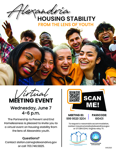 Event Details:Alexandria Housing Stability from the Lens of Youth: The Partnership to Prevent and End Homelessness is pleased to invite you to a virtual event on housing stability from the lens of Alexandria youth.