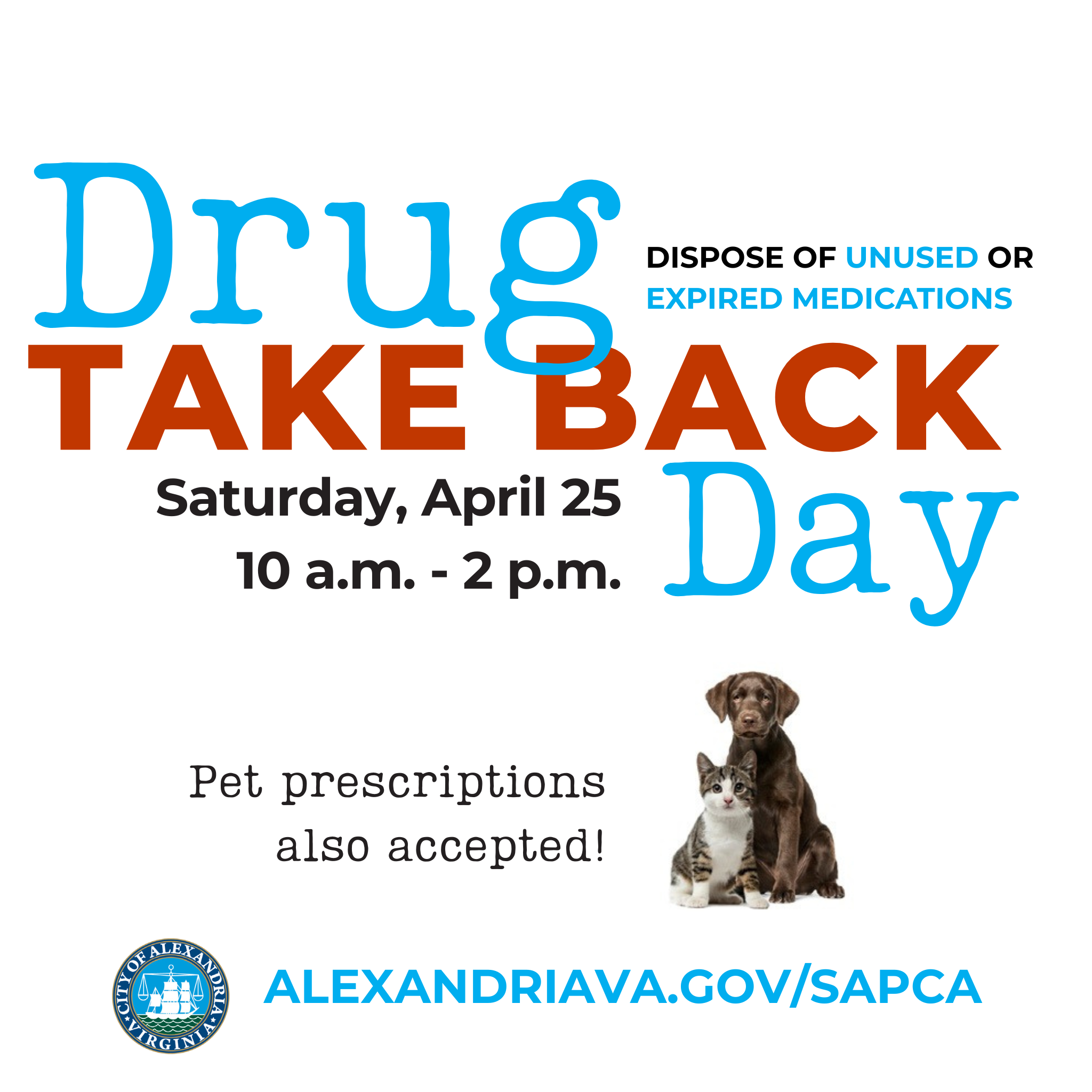 As part of the Drug Enforcement Administration's National Drug Take Back Day, the Alexandria Police Department, Alexandria Sheriff’s Office, and Alexandria Health Department, with cooperation from the Substance Abuse Prevention Coalition of Alexandria, are staffing multiple drop-off locations for safe medication disposal.